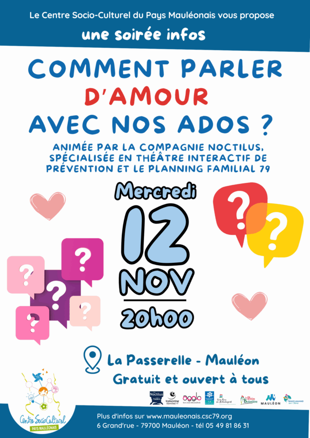 Le secteur jeunesse du Centre Socio-Culturel du Pays Mauléonais organise une soirée sur la thématique : « Comment parler d’amour avec nos ados ? », le mercredi 12 Novembre à 20h à la Salle de la Passerelle à Mauléon-ville.